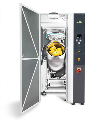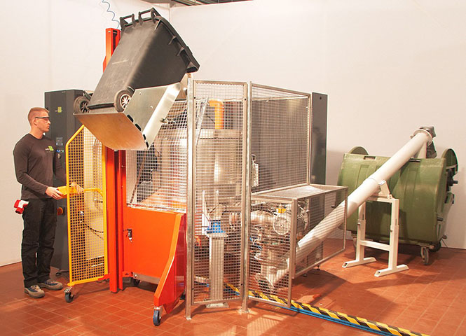 O reservatório de aço inoxidável (316L) de alto grau está conforme a Diretiva de Equipamentos sob Pressão e é equipado com um eixo ligado a um motor, com lâminas de alto poder de trituração/ moagem que podem girar nas duas direções para reduzir o tamanho e o volume do lixo a 20% do que era antes. A câmara é construída com aspersores internos para a limpeza automática e é equipada com uma porta com mecanismo de fechamento automático.